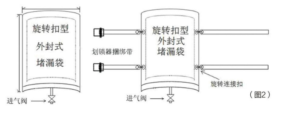 - 2、旋轉(zhuǎn)扣型:應(yīng)用在金屬、塑料、玻璃鋼材質(zhì)的各類管道、罐車、容器罐人為損壞或腐蝕穿孔跑、冒、滴、漏導(dǎo)致的圓孔、橢圓孔類泄漏充氣應(yīng)急之用,或大型落地式容器罐體底部泄漏,先將堵漏袋拉緊在泄漏部位表面后充氣達(dá)到堵漏的目的。(見圖2)